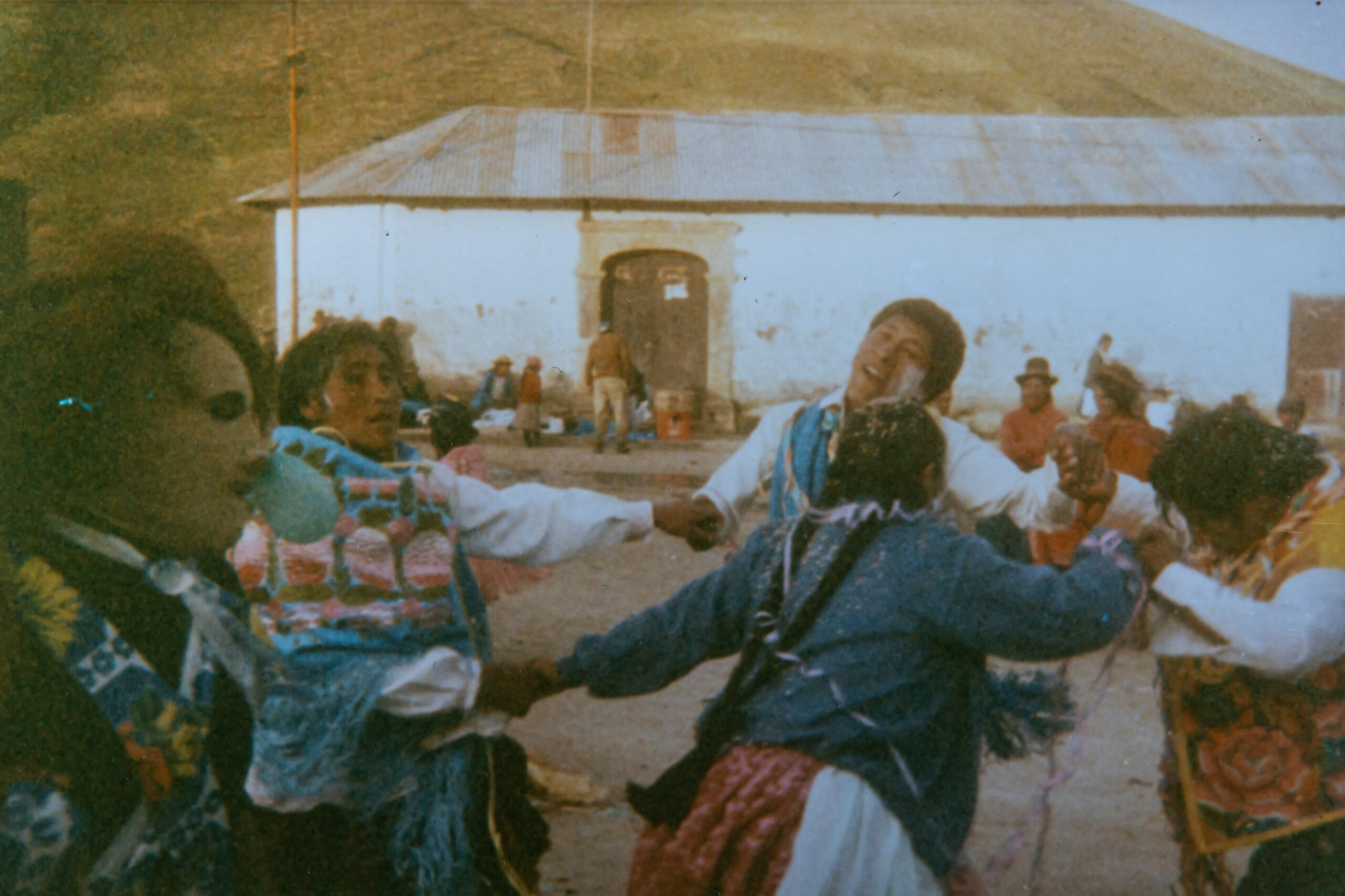 6. La fotografía muestra una escena del carnaval de 2008, celebrada en la plaza del distrito de Antauta. Las personas en la foto, entre ellas mis padres, forman un círculo bailando la pandilla puneña, una danza que combina elegancia, coquetería y el orgullo de nuestra cultura. Entre los protagonistas también se distingue a un personaje con un machu ch’ullo, pasamontañas blanco, que representa a un comediante carnavalesco, símbolo de la picardía y el humor popular