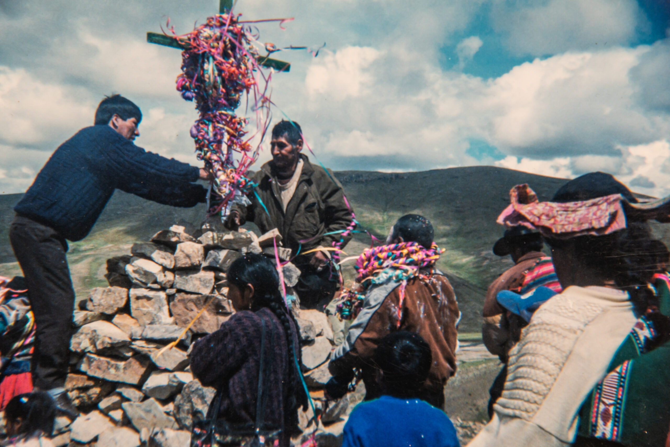 7. Pobladores de Antauta realizando ritual alcance a la cruz de Pacupacuni en los carnavales; como símbolo de guardian y protector de la Comunidad Campesina Union Antauta. en el año 1994